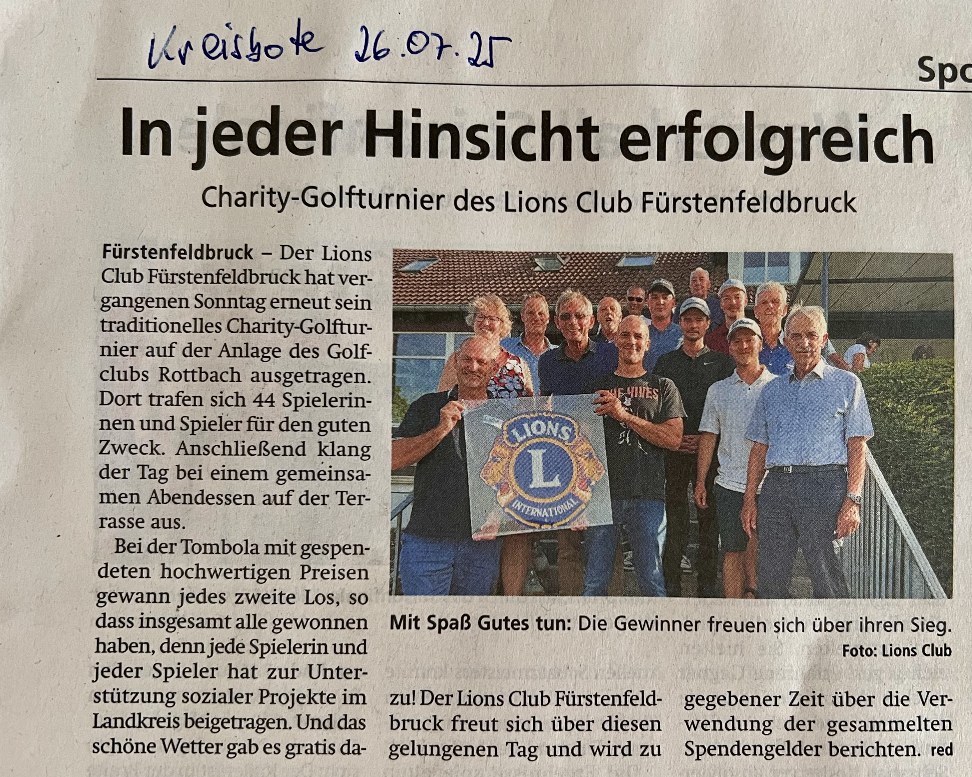 Der Lions Club Fürstenfeldbruck hat vergangenen Sonntag erneut sein traditionelles Charity-Golfturnier auf der schönen Anlage des Golfclubs Rottbach ausgetragen. Dort trafen sich 44 Spielerinnen und Spieler für den guten Zweck. Nach den 4 – 5 Stunden auf dem Golfplatz klang der Tag bei einem gemeinsamen Abendessen auf der Terrasse aus. Bei der Tombola mit gespendeten hochwertigen Preisen gewann jedes 2. Los, so dass insgesamt alle gewonnen haben, denn jede Spielerin und jeder Spieler hat zur Unterstützung sozialer Projekte im Landkreis beigetragen. Und das schöne Wetter gab es gratis dazu! Der Lions Club Fürstenfeldbruck freut sich über diesen gelungenen Tag und wird zu gegebener Zeit über die Verwendung der gesammelten Spendengelder berichten.