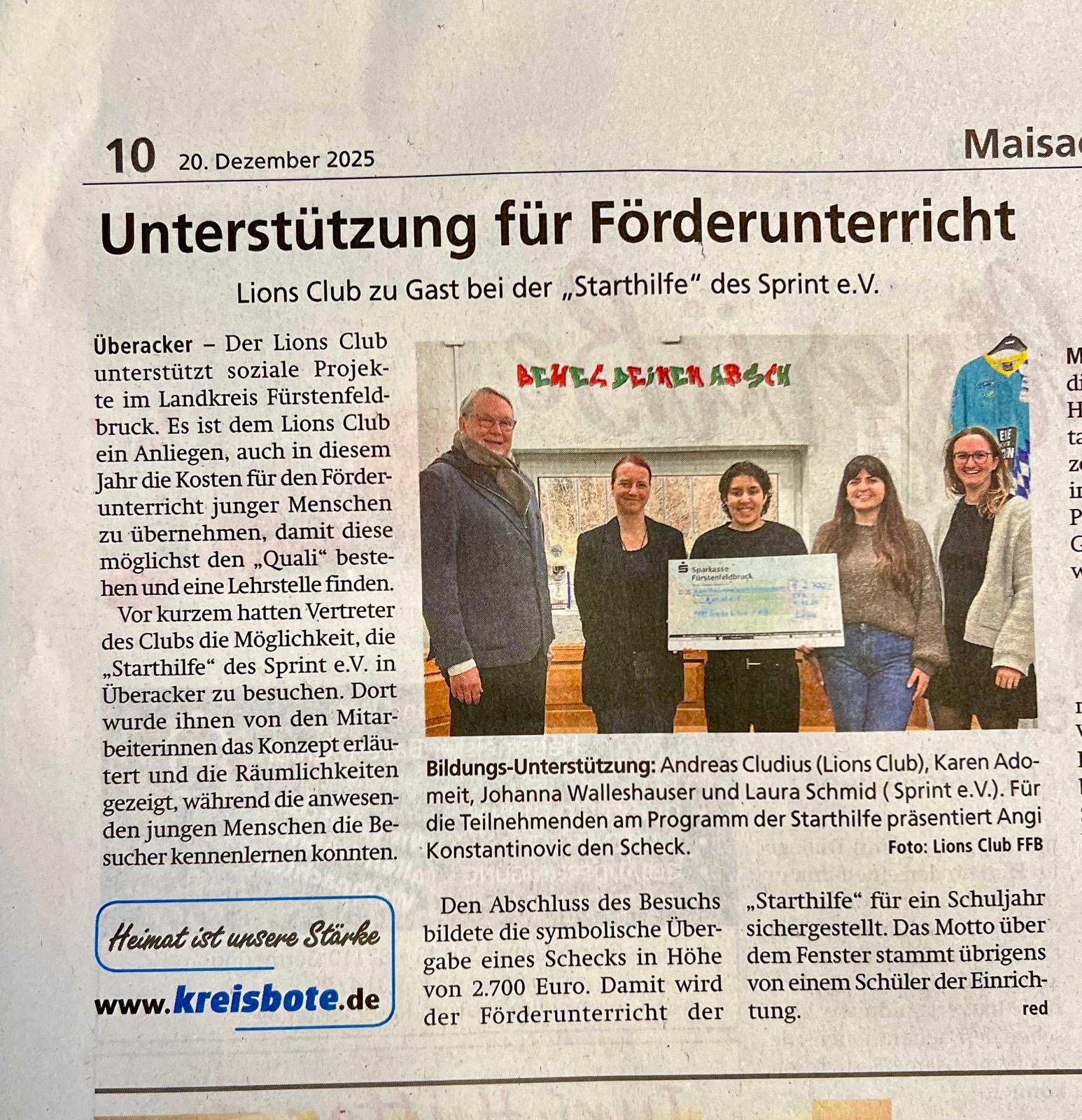 Der Lions Club unterstützt soziale Projekte im Landkreis Fürstenfeldbruck. Es ist dem Lions Club ein Anliegen, auch in diesem Jahr die Kosten für den Förderunterricht junger Menschen zu übernehmen, damit diese möglichst den „Quali“ bestehen und eine Lehrstelle finden. Vor kurzem hatten Vertreter des Clubs die Möglichkeit, die „Starthilfe“ des Sprint e.V. in Überacker zu besuchen. Dort wurde ihnen von den Mitarbeiterinnen das Konzept erläutert und die Räumlichkeiten gezeigt, während die anwesenden jungen Menschen die Besucher kennenlernen konnten. Den Abschluss bildete die symbolische Übergabe eines Schecks in Höhe von 2.700 €. Damit wird der Förderunterricht der „Starthilfe“ für ein Schuljahr sichergestellt.
